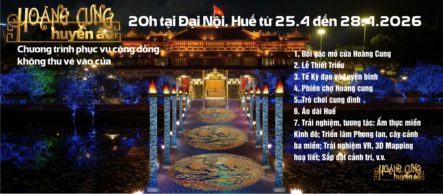 Trong khuôn khổ Festival Huế 2026, chương trình “Hoàng cung Huyền ảo” sẽ chính thức diễn ra từ 20h các buổi tối từ 25/4-28/4/2026 tại Đại Nội Huế.